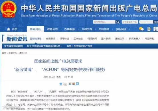 针对“新浪微博”、“ACFUN”、“凤凰网”等网站在不具备《信息网络传播视听节目许可证》的情况下开展视听节目服务,并且大量播放不符合国家规定的时政类视听节目和宣扬负面言论的社会评论性节目,国家新闻出版广电总局于近日发函责成属地管理部门,按照《互联网视听节目服务管理规定》(广电总局、信息产业部第56号令)的有关规定,采取有效措施关停上述网站上的视听节目服务,进行全面整改,为广大网民营造一个更加清朗的网络空间。