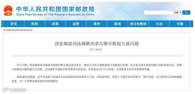 6月3日凌晨,国家邮政局官方微信公众号发布文章称,6月2日晚,国家邮政局召集菜鸟网络和顺丰速运高层来京,就双方关闭互通数据接口问题进行协调。双方表示,将从讲政治顾大局的高度出发,积极寻求解决问题的最大公约数,共同维护市场秩序和消费者合法权益,并同意从6月3日12时起,全面恢复业务合作和数据传输。