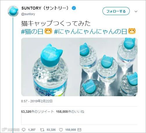 2019年的猫之日,三得利公司借势发布了一款猫咪形状瓶盖,可爱到犯规了!