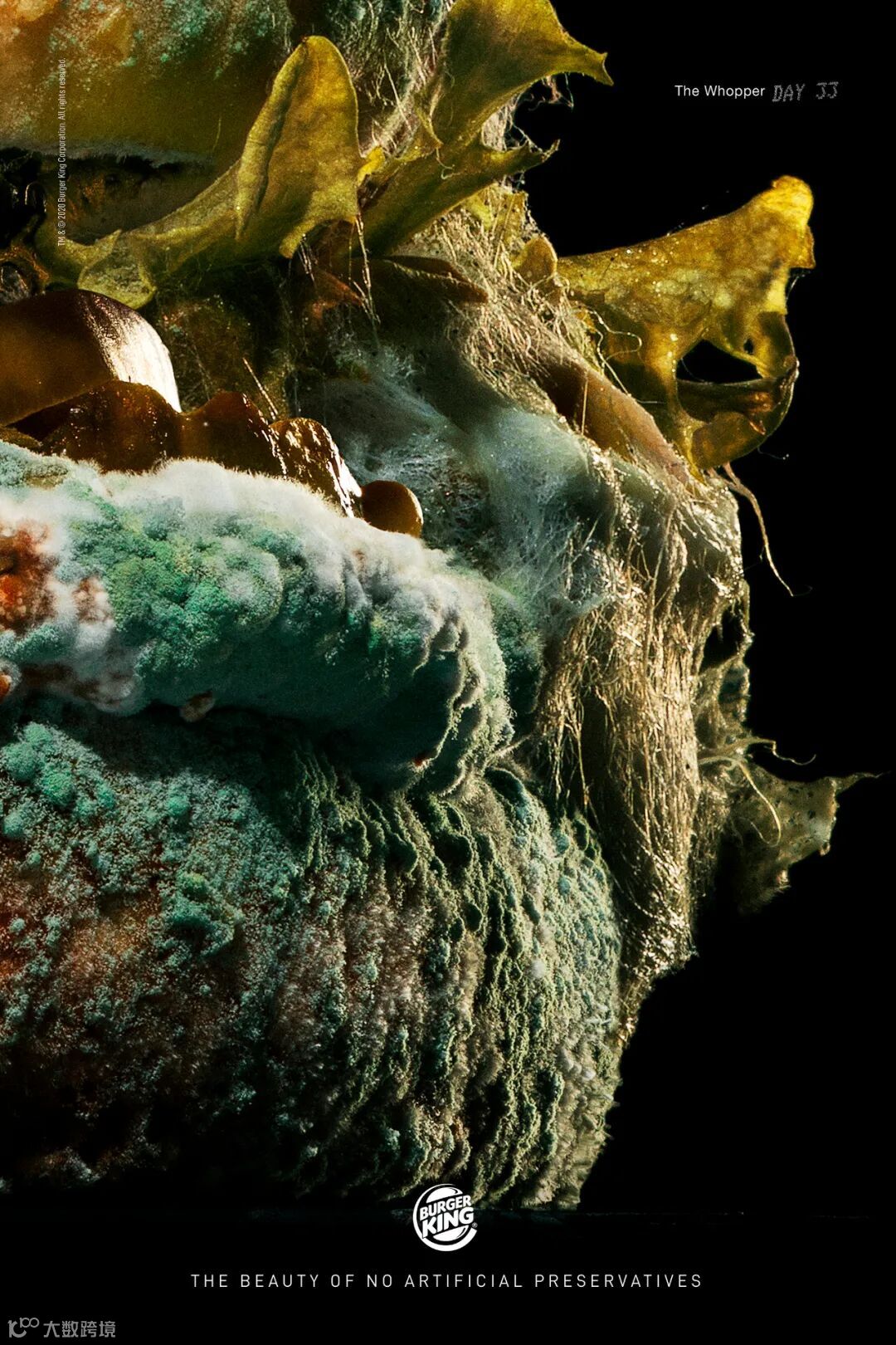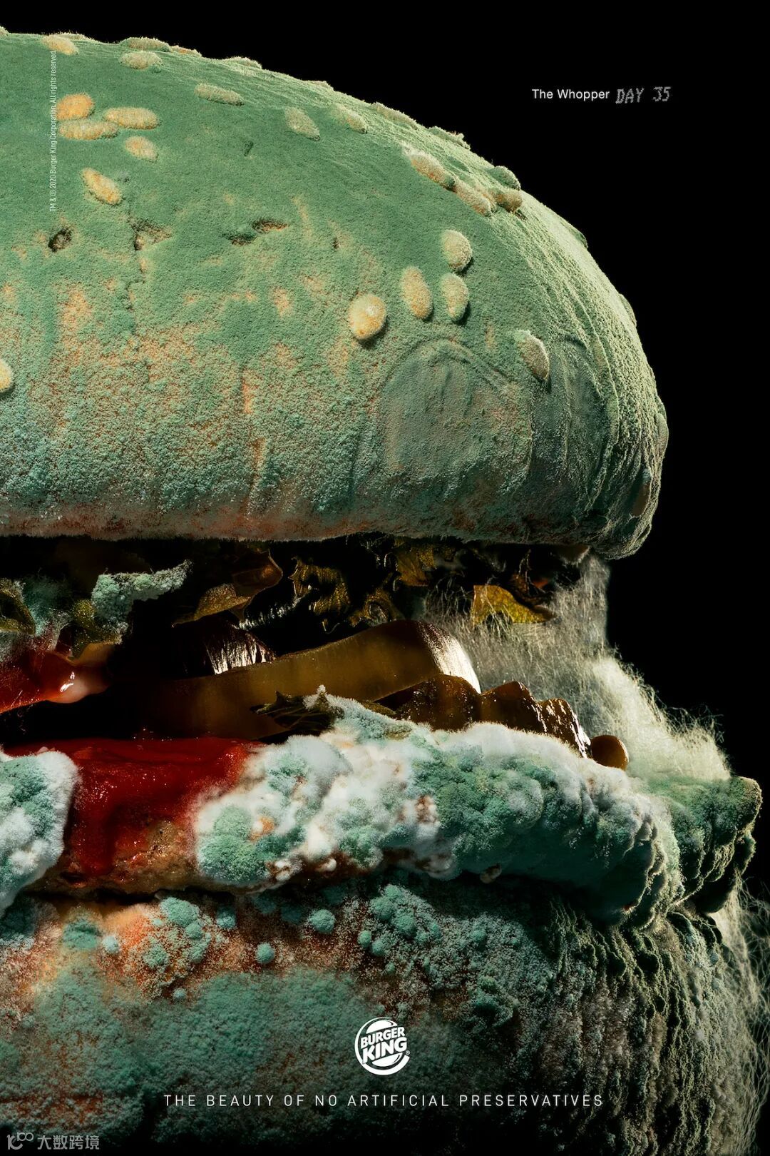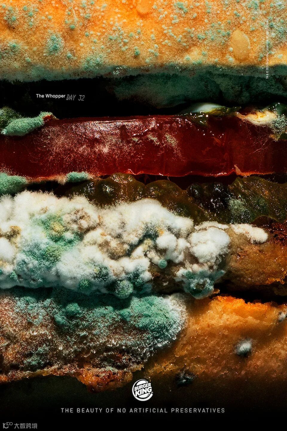 尽管麦当劳已经对此事做出了回应,但这一点又双叒被老对手汉堡王捕捉到了!「Mold can be a beautiful thing.」餐厅不可能也绝不会出售发霉的食物,但这的确有力的宣传了汉堡王无添加的决心。 据悉,汉堡王已经在美国的400家门店推出了无添加的皇堡,并将在2020年底覆盖全美。 正常人才不会用发霉的食物做为宣传卖点,而汉堡王却出奇招,至于口碑嘛,广告界和消费者出现了两个极端。著名广告网站ADWEEK对这个创意和执行赞不绝口,撰文力赞: There are only two eras in advertising: ads that came out before Burger King’s Moldy Whopper, and ads that came out after Burger King's Moldy Whopper.(渣翻译:“发霉的皇堡”是广告界的分水岭。)在广告界获得赞美,在评论里却多是网友不买账的声音。毕竟,如果没有一颗强大的心脏是无法看完这些真实大特写后还能吃得下饭。 前方高能,正在吃饭的小伙伴慎入!!!