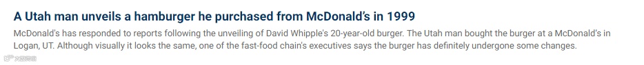 今年2月,一向以鬼点子出名的汉堡王再度荣登话题榜:明星产品皇堡发霉了! 手中的皇堡先别急着丢,这并不是说有人在店里吃到了发霉的皇堡,而是汉堡王以「发霉的皇堡」为Campaign,主动发布了一支延时视频,向人们展示了一个月内,一只皇堡发霉的全过程。先来看看完整版视频: 如果说看之前还是一脸懵不敢相信一家快餐店敢自曝“黑点”,看到最后那句「THE BEAUTY OF NO ARTIFICIAL PRESERVATIVES.」(渣翻译:不含添加剂的美),才明白这是汉堡王的又一次自黑:良心汉堡王,不含防腐剂。为了吸引那些追求健康饮食的消费者,是的,600卡路里的皇堡拿在手,内心依旧是健康无油炸的追求,这些年来,汉堡王一直声称他们已经取消了人工色素和味精的添加。这一举动不禁又让人想到了他相爱相杀多年的CP:麦当劳。今年年初,美国犹他州的一名男子发文宣称,20年前在麦当劳买的汉堡,20年后竟然没有腐坏!(竟然会有人买了一个汉堡20年不吃???)
