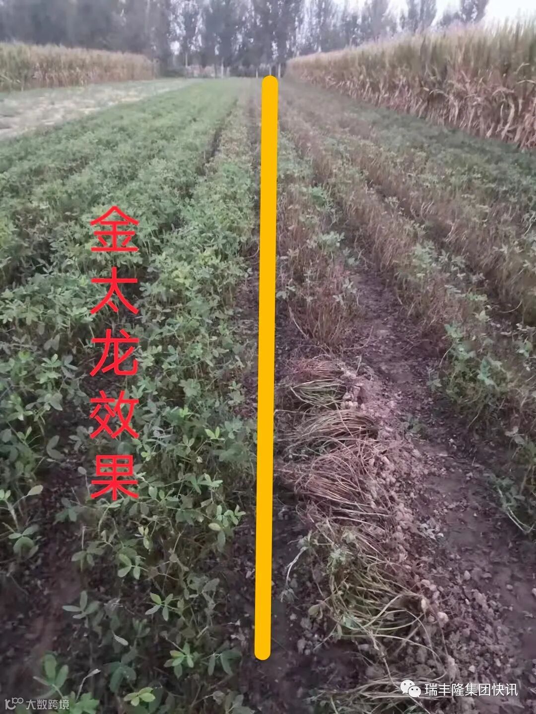 导读:同一地块的花生,左边的喷施了两次金太龙,右边的没有使用金太龙,一场秋雨,效果立现!对比差异太明显!金太龙抗早