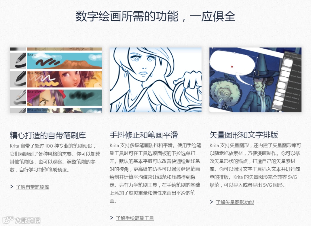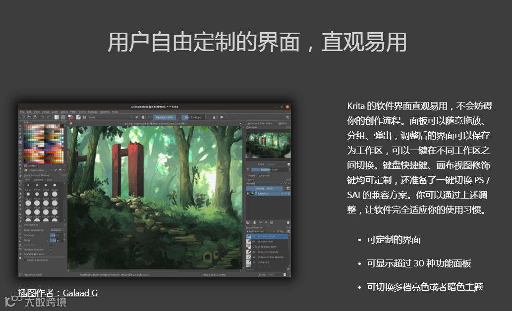 KRITA是一款自由开源的免费绘画软件,无需注册,无广告,无试用或商用限制,让每一位画师都可以有尊严的表达创意。支持MAC/LINUX/WINDOWS系统。