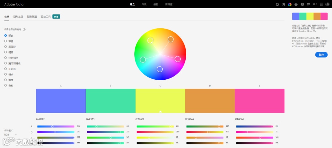 Adobe Color CC 轮是最灵活、最强大的调色板之一,凭借强大的定制功能和用户灵活性,将帮助您找到最适合的完美颜色。