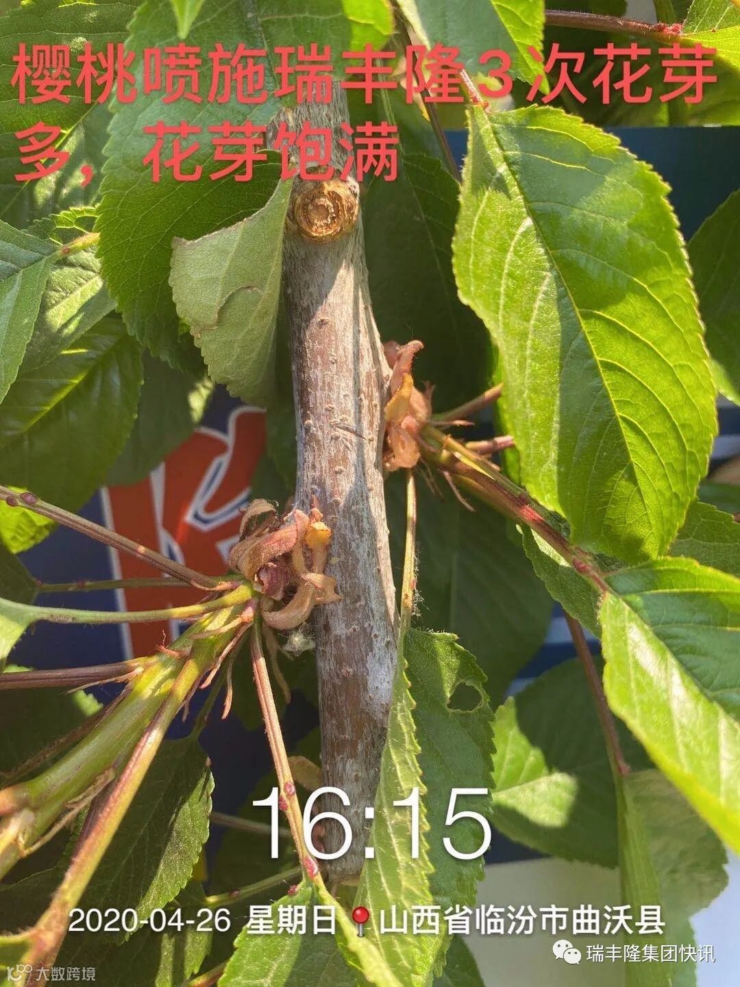 喷施使用了瑞丰隆的樱桃,花芽多花芽饱满,果个儿均匀,叶片大,宽厚而油亮,从使用了3次瑞丰隆的樱桃来看,五月定是果满枝的丰收景象!