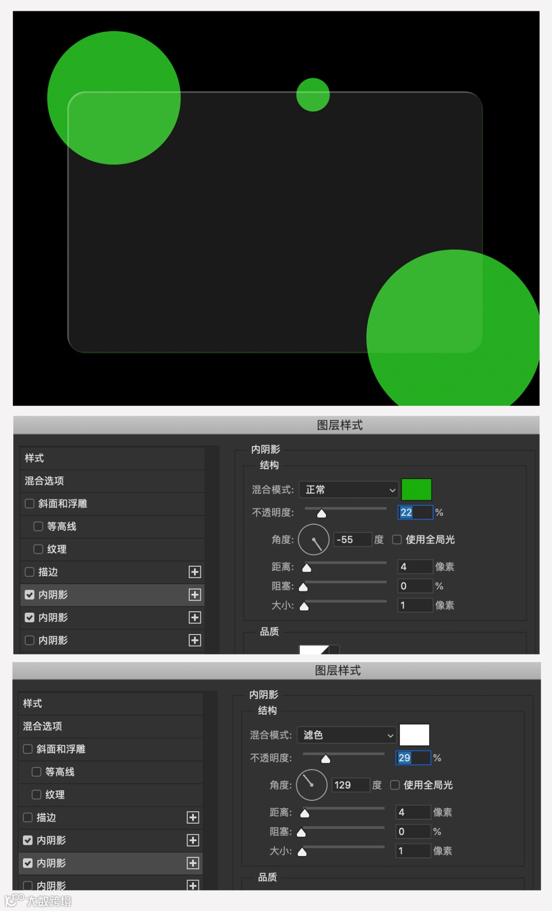 1-2 把圆角矩形的填充设置为10%,添加3个内阴影,参数可参考下图: