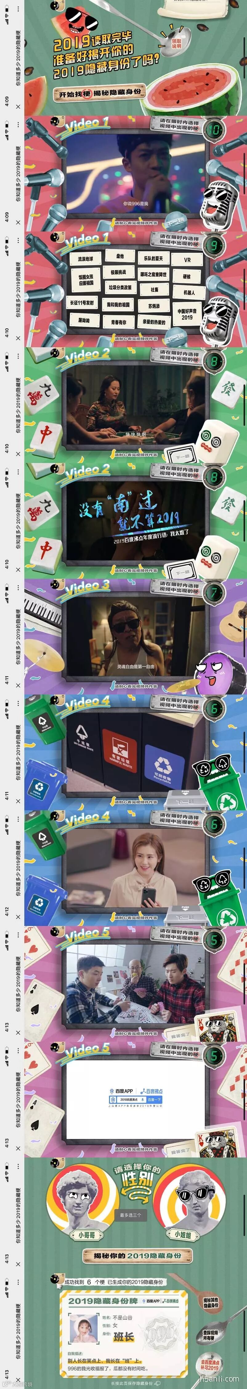 整体创意内容基于百度沸点产出的年度榜单热点词,将热点词实体化埋藏在各个场景,动作,台词,衣饰中,串联起2019年度记忆,是一支兼具观赏性及互动性的视频嵌套式答题H5。
