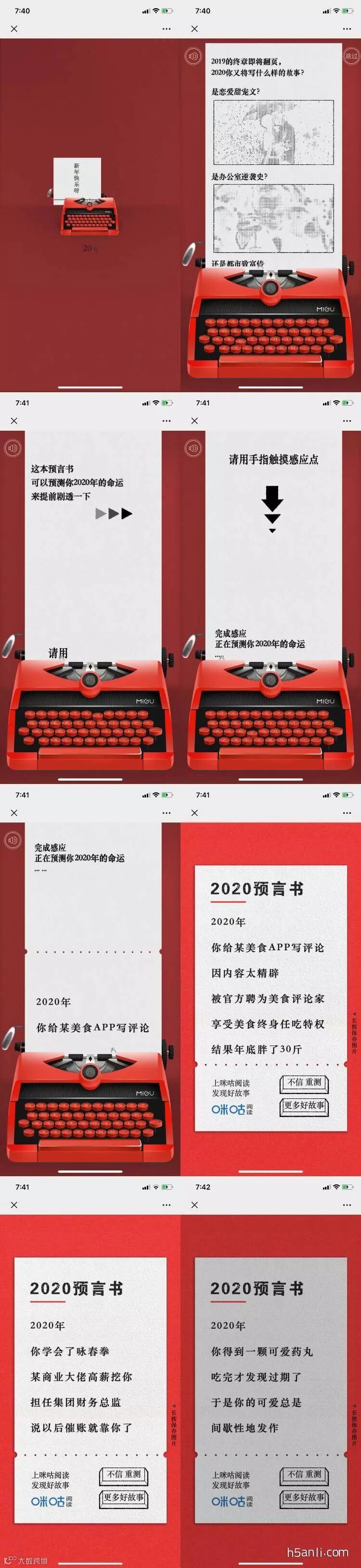 作品全程是一台打印机缓缓打字,表达了对2020的美好展望,然后邀请用户点触指纹图案,预测新年运势。