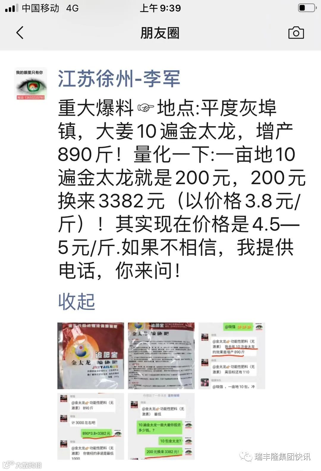 重大爆料☞地点:平度灰埠镇,大姜10遍金太龙,增产890斤!量化一下:一亩地10遍金太龙就是200元,200元换来3382元(以价格3.8元/斤)!其实现在价格是4.5—5元/斤.如果不相信,我提供电话,你来问!