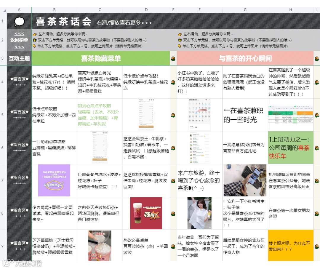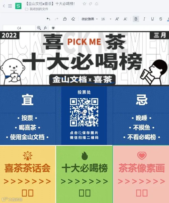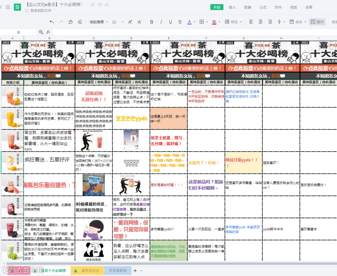 近几日,喜茶联合金山文档开展了一次粉丝投票及互动的平台的尝试,用户可以在「十大必喝榜」为喜爱的饮品打 call、在「喜茶茶话会」分享与喜茶的小故事、在「茶茶像素画」里绘画。此外,金山文档还让旗下测评小分队,突击喜茶线下门店,与员工对暗号,获取饮品。