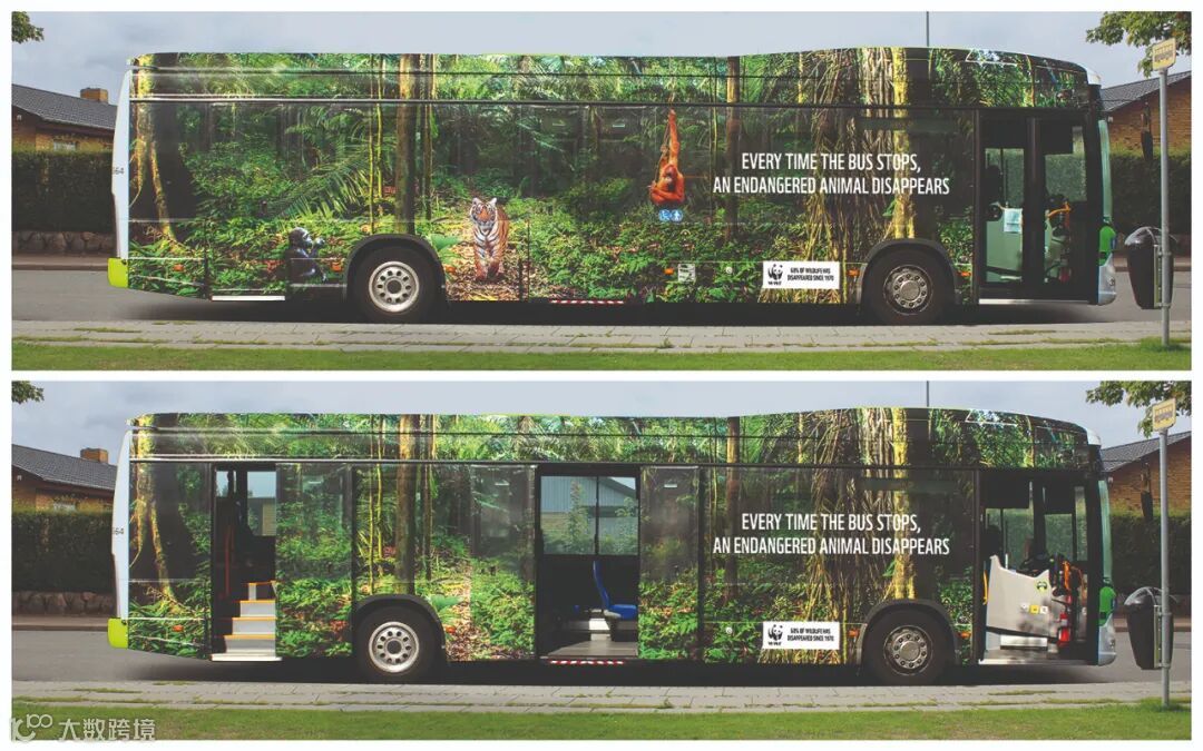 Every time the bus stops, an endangered animal disappears.(巴士每停靠一次,就有一种濒危动物消失。)