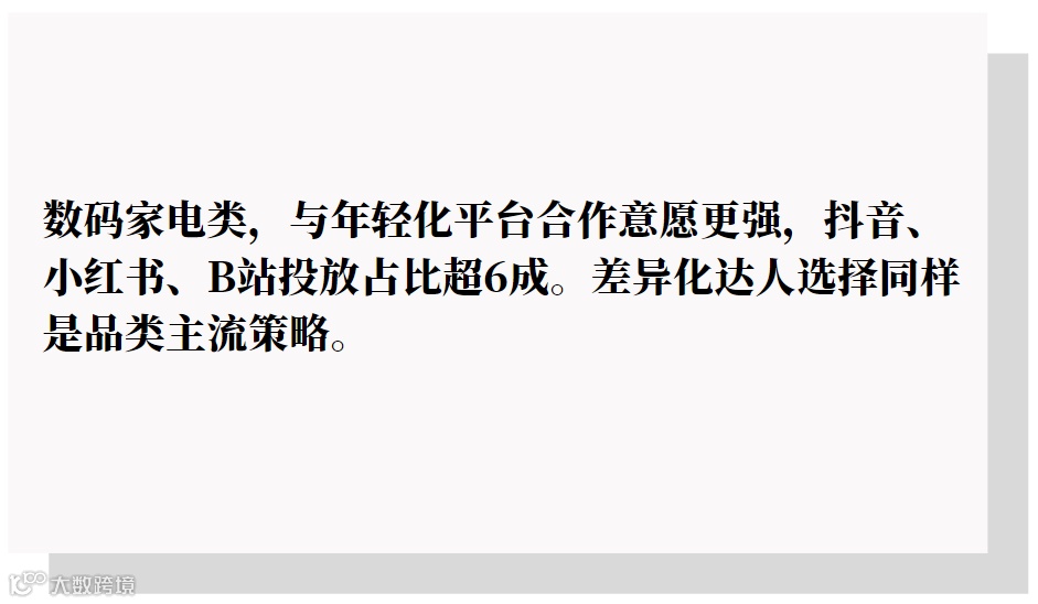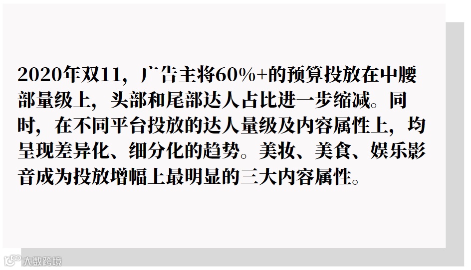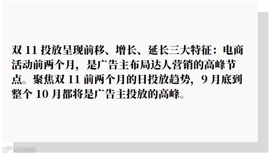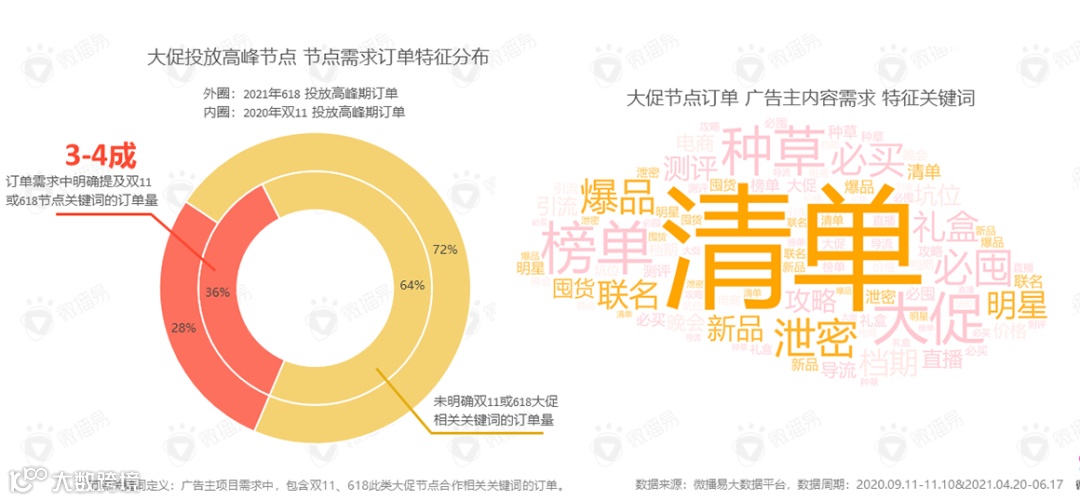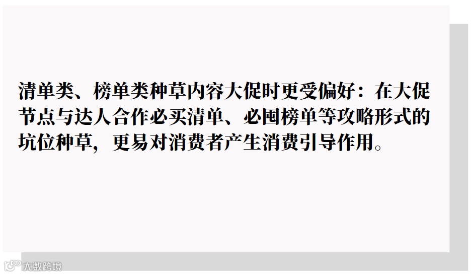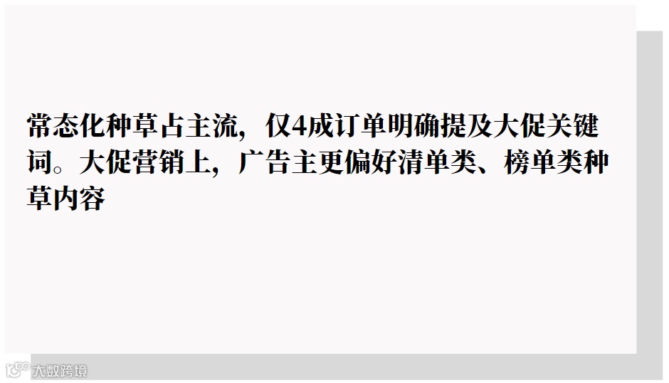 在双 11 及 618 投放高峰阶段,强调大促节点关键词的广告主需求仅占 3-4 成,温和、常态化的达人内容种草才是主流。