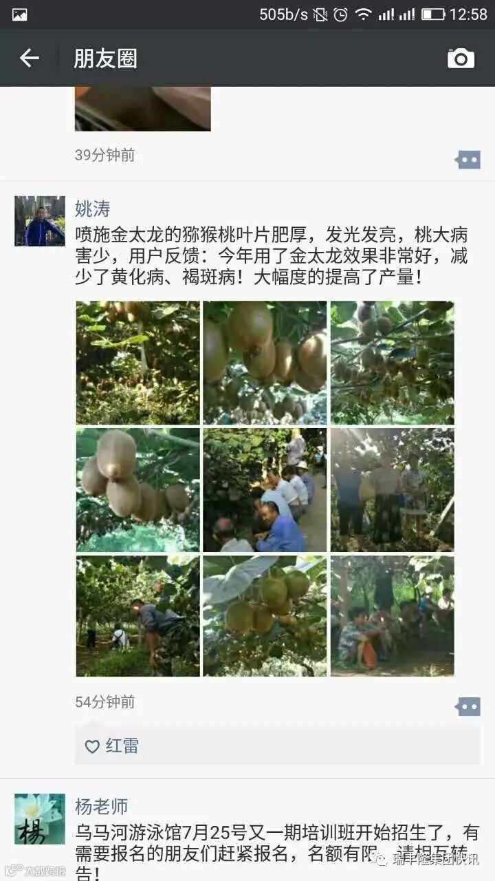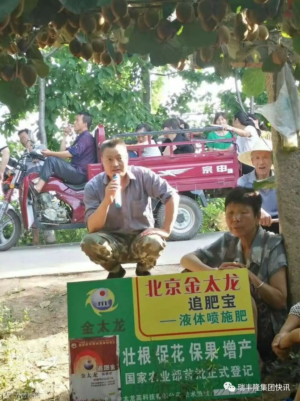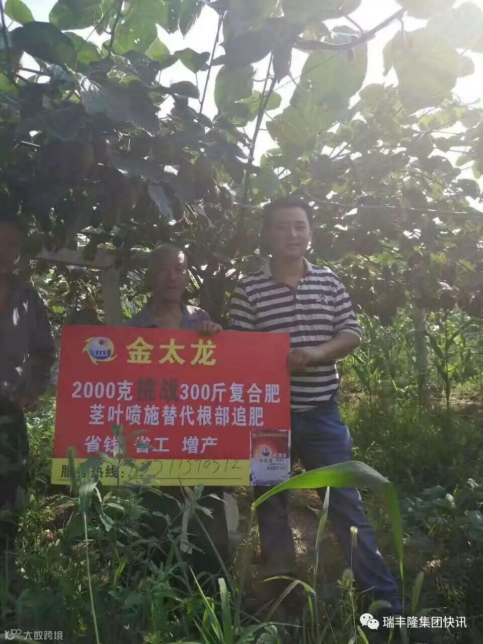 瑞丰隆集团快讯喷施金太龙的猕猴桃叶片肥厚,发光发亮,桃大病害少,用户反馈:今年用了金太龙效果非常好,减少了黄化病、褐斑病!大幅度的提高了产量!陕西宝鸡地区猕猴桃专区的姚涛经理,深入用户中,真实了解各位用户使用金太龙后的效果并留下回访纪实!