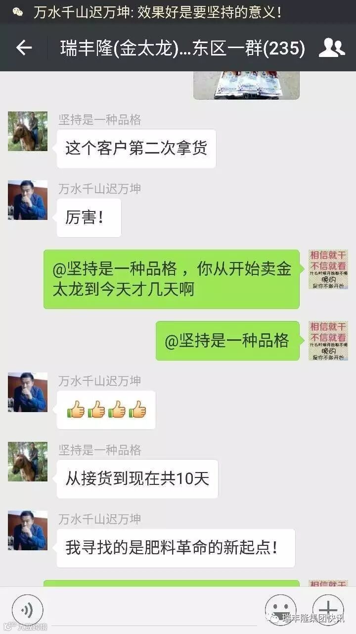 一个产品坚持了十多年,品牌屹立不倒,品质经得起考验,业务队伍不断壮大,说明了什么?唯一的回答:产品的效果好就是坚持下去唯一的理由和意义!山东大区的李经理通过他的微信聊天记录,真实再现——金太龙的好效果是经销商朋友们长期坚持推广的最大动力!