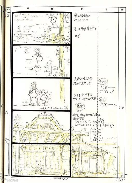 虽然是以脚本为基础的设计图,当中除了脚本的内容,还包括对绘画的要求,对演出意图、画面构图,以及摄影技法、台词和音响效果等的指示。这是向所有工作人员一并提出的要求。