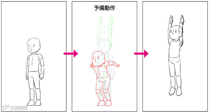 接下来就是原画了。参考layout和分镜画出动作的关键衔接处。比如画“跳”这个动作的时候,就需要画出“站在地上”“起跳前的预备动作”“跳起时腾空的最高点”“着地”等画面,也就是最能表现这个动作本质的地方。原画控制着动作的关键,因此在海外被称为“key animation”。