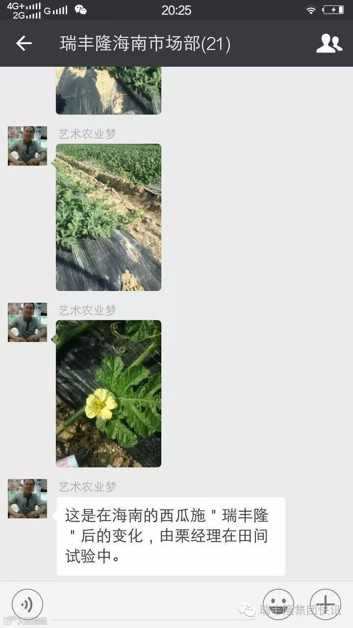瑞丰隆集团快讯瑞丰隆海南市场作为今年后半年才进入的市场,负责人栗纯经理从当地的经济作物西瓜入手,开始了瑞丰隆的喷施示范打基础环节。昨日,传回高清图片,在西瓜的苗株生长期喷施瑞丰隆既能促进枝条生长,藤蔓延展,同时对后期开花、结瓜等都有帮助。其中一张图西瓜苗已经开花,因为花后的西瓜需肥量会增大,此时继续喷施瑞丰隆,可使西瓜开始迅速膨大着色,促进生长,瓜大瓢红,增甜增色。