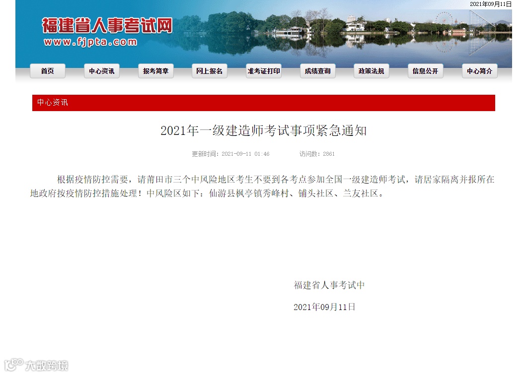 根据疫情防控需要,请莆田市三个中风险地区考生不要到各考点参加全国一级建造师考试,请居家隔离并报所在地政府,按疫情防控措施处理!中风险区如下:仙游县枫亭镇秀峰村、铺头社区、兰友社区。