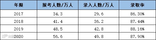 从下方数据中可以看出:成人高考的通过率平均为87%,也就是56.6万人中,我们有49.8万的人都能顺利录取,剩余小概率中包含了未通过、弃考、作弊等人群。