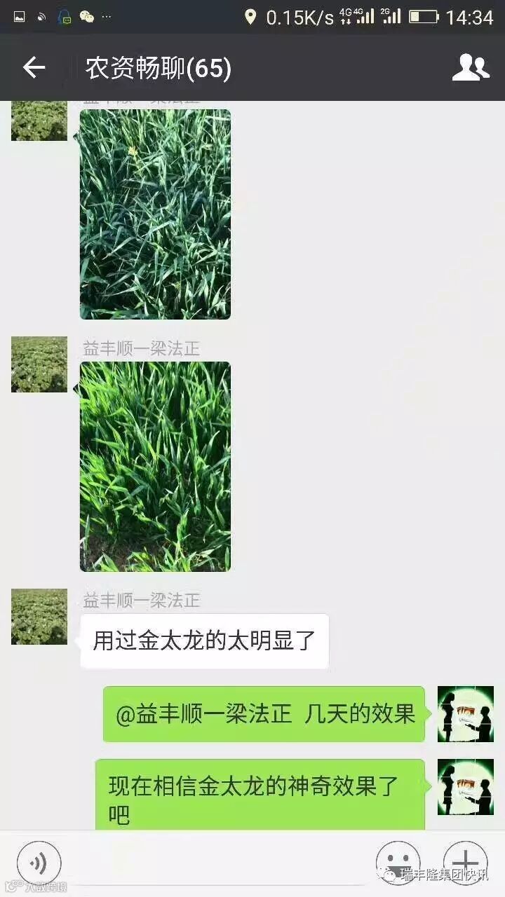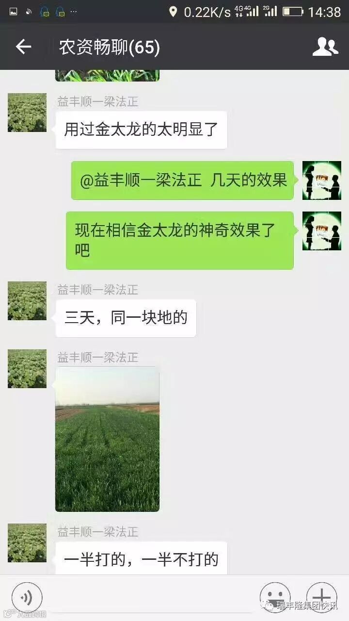 瑞丰隆集团快讯青岛胶州的经销商在小麦上用了金太龙后传回效果反馈图,还有个前提:山东这边的小麦都是用尿素冲过了的,本身就没有发黄的小麦苗,但是金太龙知难而上,还是在同一块地上做出了明显的效果(金太龙无激素)!这只是开端,增产也明显,等收麦子的时候再比较!感谢青岛胶州市场部——相信金太龙,相信国产,为金太龙又创造一力作!