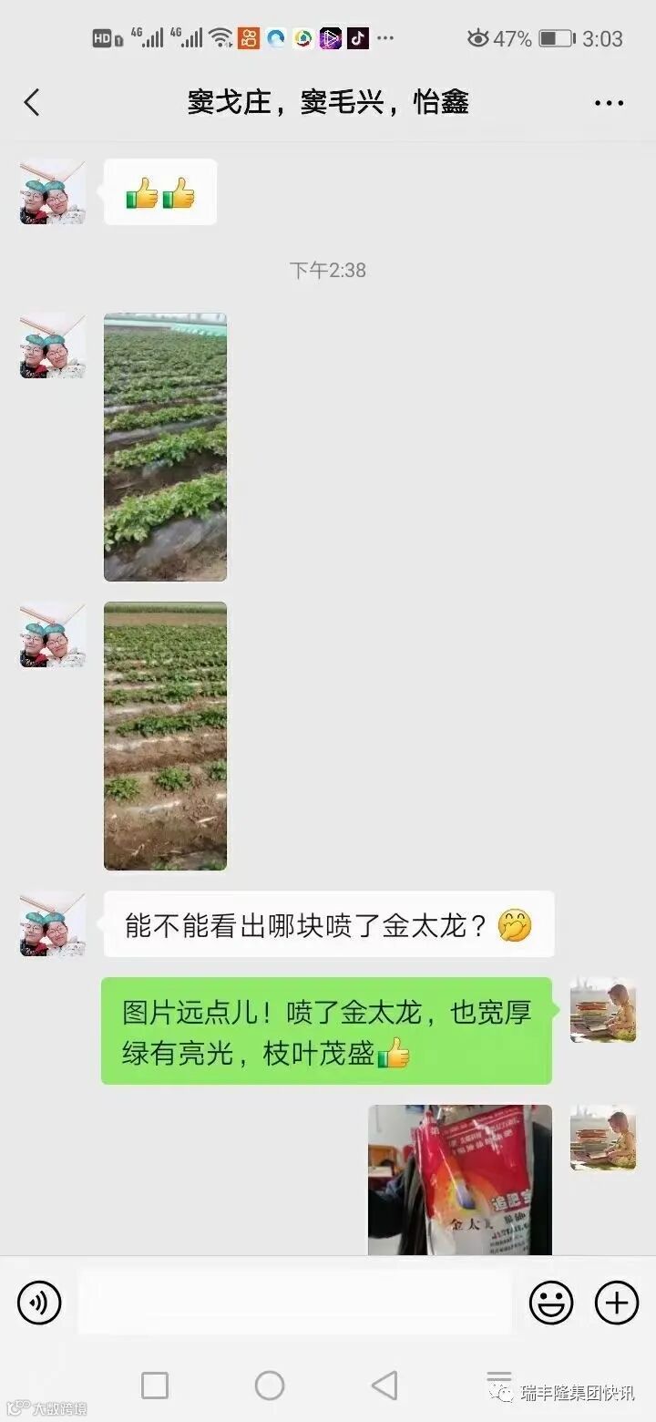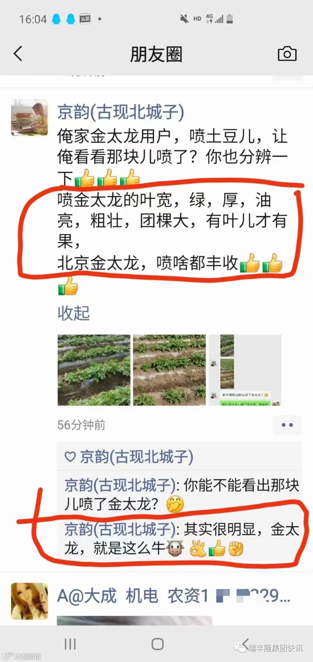 导读:金太龙山东地区的用户,喷施土豆,效果极棒!喷施了金太龙的土豆叶宽、绿、厚、油亮、粗壮、团棵大!用户说:北京金