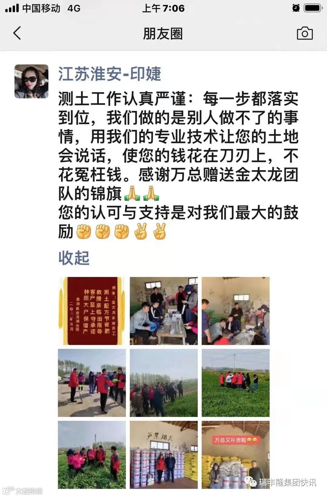 团队启动测土工作!在专业老师的指导下,测土工作认真严谨:每一步都落实到位!我们做的是别人做不了的事情,用我们的专业技术让您的土地会说话,使您的钱花在刀刃上,不花冤枉钱。感谢万总赠送金太龙团队的锦旗!
