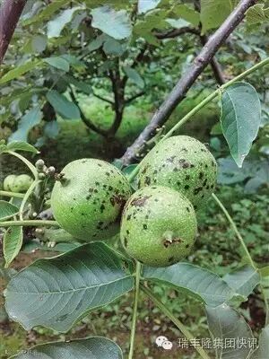 农医生答: 核桃黑斑病。 此病主要危害叶片、新梢、枝条和果实。果实发病初期,果面出现褐色小斑点,病斑边缘不清晰,逐渐扩大,形成近圆形或不规则形漆黑色病斑,下陷或不下陷。在雨天,病斑四周呈明显的水渍状。幼果发病,病菌侵害到核仁,使核仁腐烂。果实长到中等大小以后染病,病变只限于外果皮,但核仁生长受阻碍,采收后干瘪。 防治建议:发病后,全园喷70%甲基硫菌灵800+25%丙环唑4000倍,或70%甲基硫菌灵500倍+72%农用链霉素1500倍,每隔7天喷施一次,两种配方交替使用,连喷2-3次。
