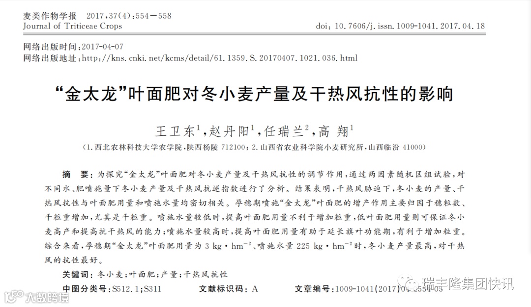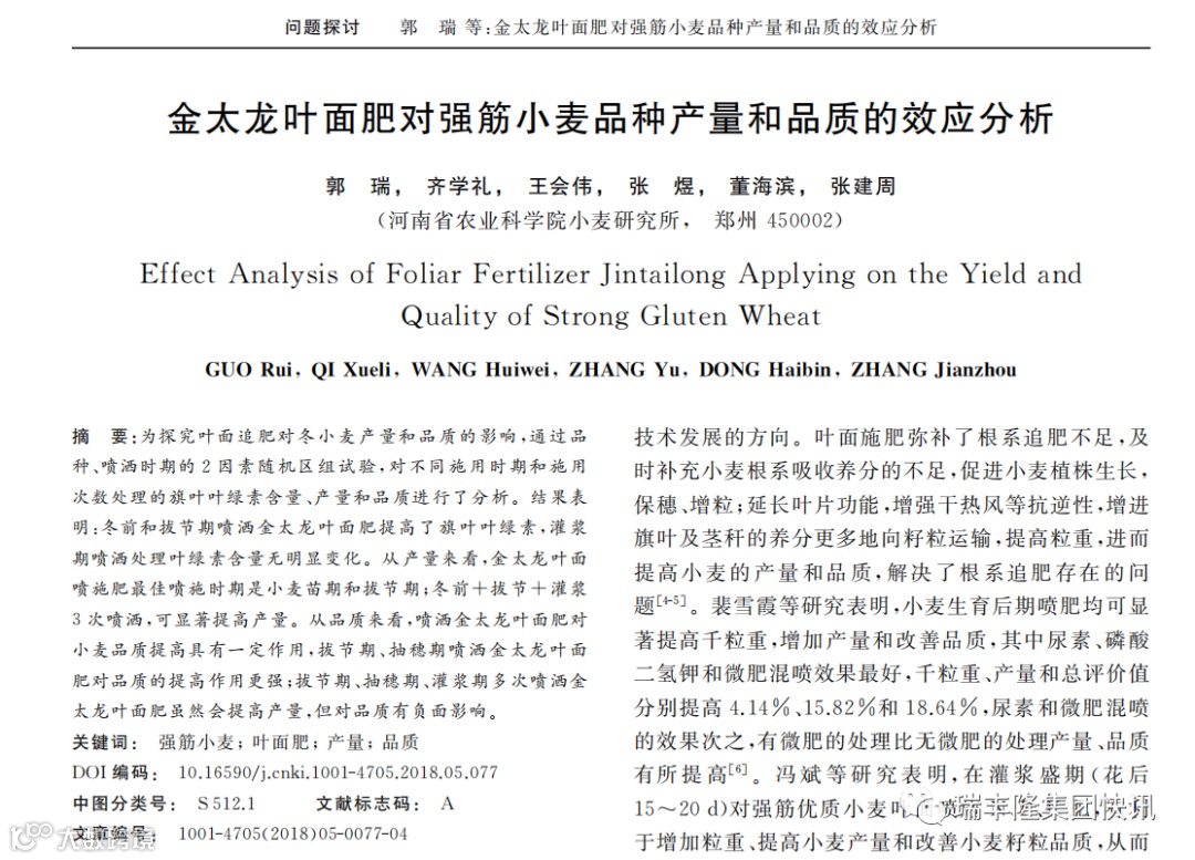 河南省农业科学院小麦研究所,西北农业科技大学农学院,山西省农业科学院小麦研究所在各自专刊杂志上发表了,权威部门做的“金太龙”增产科研数据,不同时期及浓度喷施“金太龙”的小麦处理结果,最低12%,最高23.9%!