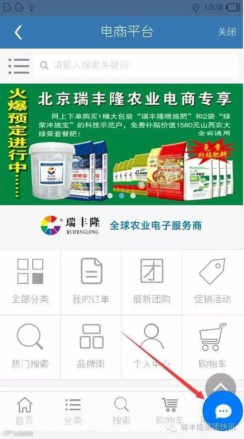 第三步,进入电商平台界面后,请点击右下方蓝色的对话图标(下图红色箭头所指图标)。