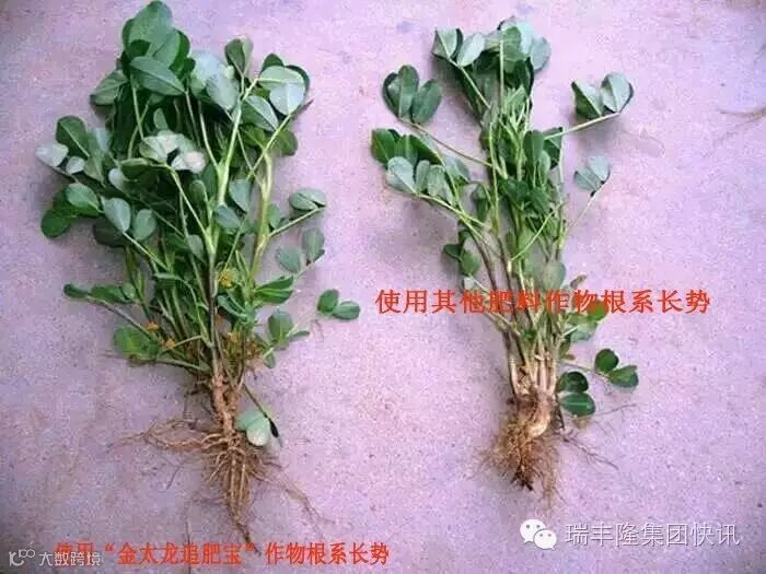 现在正值农作物生长的黄金时期,金太龙农艺师忙活在田间地头,顺手拔起一颗使用“金太龙追肥宝”的花生苗,发现根系较多,茎根粗壮,枝叶繁茂。又拔起旁边一家农田施用别家肥的花生苗。对比发现长势远不如施用“金太龙追肥宝”的花生苗。