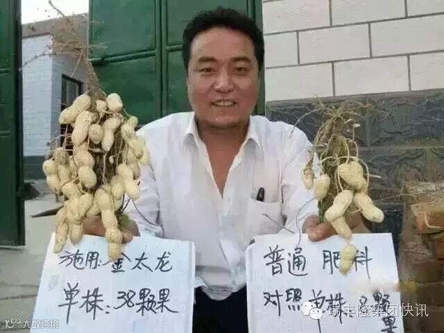 下图为徐州市场部业务经理 拍摄李大哥家花生成熟后效果。施用“金太龙追肥宝”花生单株结果38颗,施用普通肥料花生单株结果8颗。这一事实再一次证明施用“金太龙追肥宝”能达到增产增收的效果。