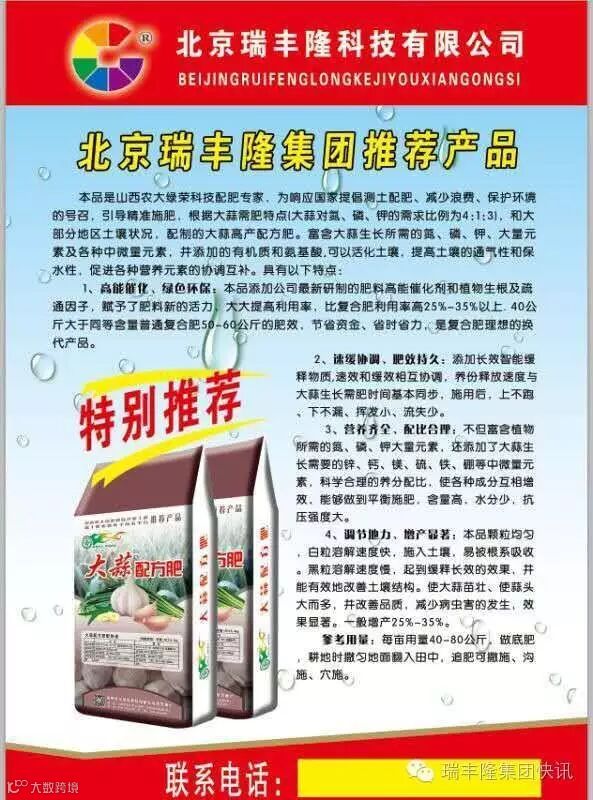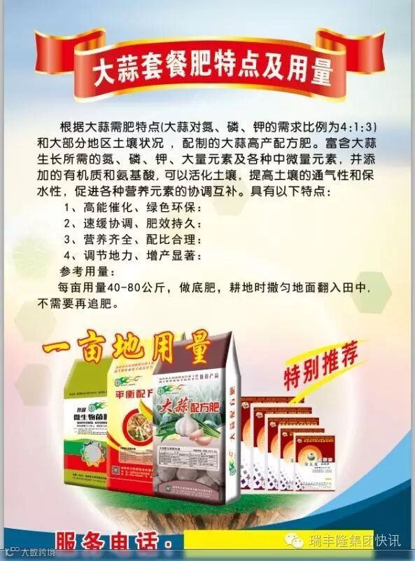3、施肥:大蒜生长期长,需肥量大,但根系浅,吸肥能力弱,所以应施足底肥,分期追肥,不断满足大蒜生长发育的需要。大蒜施肥应以有机肥为主,占总用肥量的70%,可直接使用绿荣大蒜配方肥做底肥,金太龙喷施肥分期追肥。