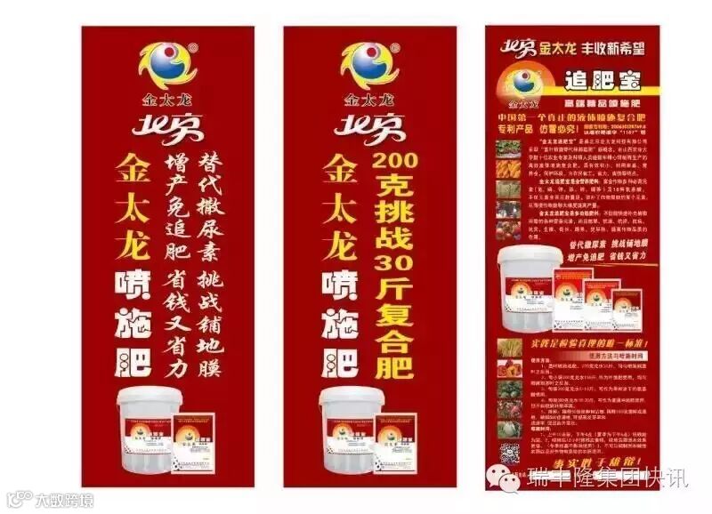 北京“金太龙追肥宝”一款用事实说话的好肥料 。 “金太龙追肥宝”是瑞丰隆集团公司旗下的一款具有“替代撒尿素,挑战铺地膜,增产免追肥,省钱又省力”这一功效的叶面喷施肥产品。产品宣称:用事实说话、用效果作证、用农民的笑容替代所有宣传广告。北京”金太龙追肥宝“一款真正全国田间地头都在使用的好肥料!大家都在用,您还在等什么?