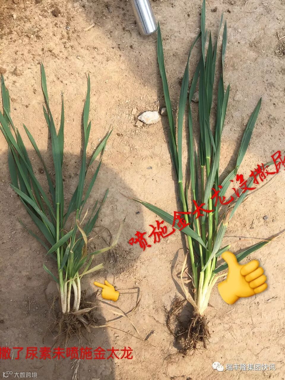 四、根系发达:种子萌芽是先从根系开始生长,根系接触金太龙液肥所含的生长调节剂和各种微量元素后,发育加快,经比对,拌过金太龙液肥的小麦根系,毛细根数量多18-21%,长度增加26-35%,抗性能力提高,植株生长健壮,抗倒伏能力增强。