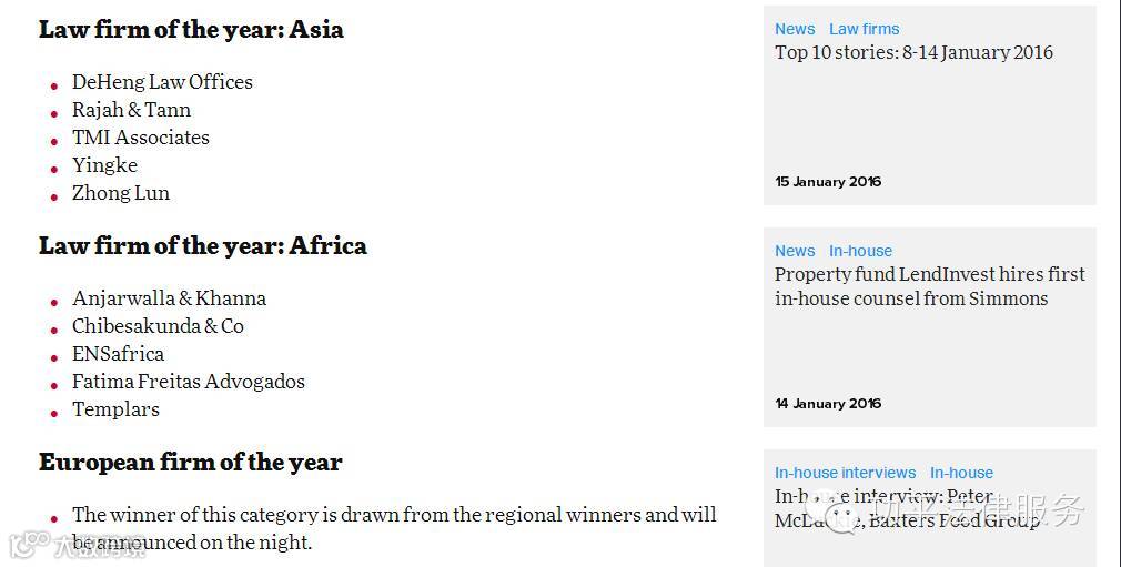 2016年1月18日,The Lawyer 发布 "2016欧洲大奖" 入围名单,盈科被列入“亚洲年度律所” 入围名单中。