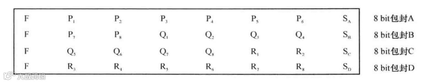 图中,P,Q.R为3个8bit字符;SA,SB,SC分别表示与P.Q.R相联系的状态比特;S。用于提供4个8bit包封组的同步。