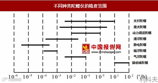根据其精度范围大致分为超高精度陀螺仪、中高精度陀螺仪和低精度陀螺仪。超高精度陀螺仪指精度范围在10-6 o/h~5*10-4 o/h范围内的陀螺仪,主要包括液浮陀螺、静电陀螺等,目前最高精度的陀螺仪是静电陀螺仪。中高精度陀螺仪指精度在5*10-4 o/h~10-1 o/h的陀螺仪,目前最有发展前景的陀螺仪是光学陀螺仪,激光陀螺属于第一代光学陀螺,光纤陀螺属于第二代光学陀螺,最近几年,由于光纤陀螺在精度、性能和尺寸上具有更大的潜力,越来越受到各国军方的青睐。低精度陀螺仪是指精度范围超过 10-1 o/h 的陀螺仪,目前发展前景较好的是MEMS陀螺仪,虽然精度低,但低廉的价格使其具有广阔的应用前景。
