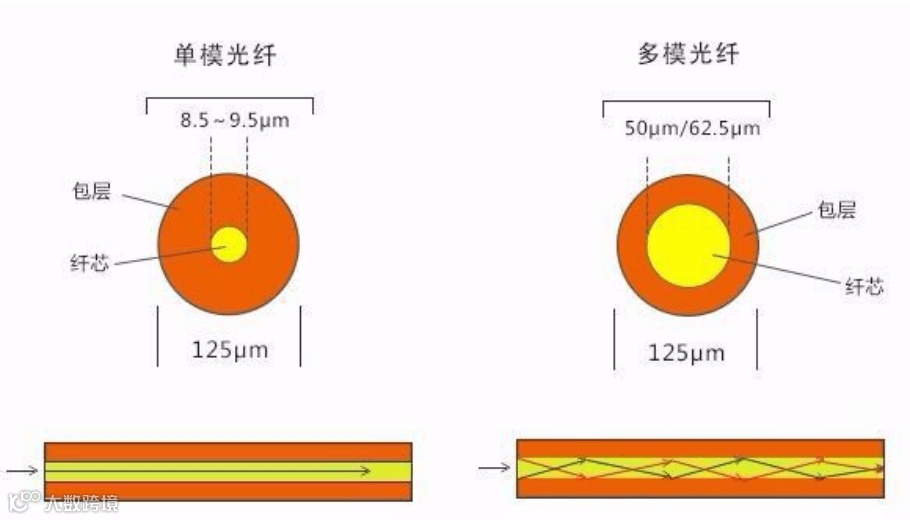 单模光纤,光沿着一条路径传播;而在多模光纤中,光在多条路径中传播。