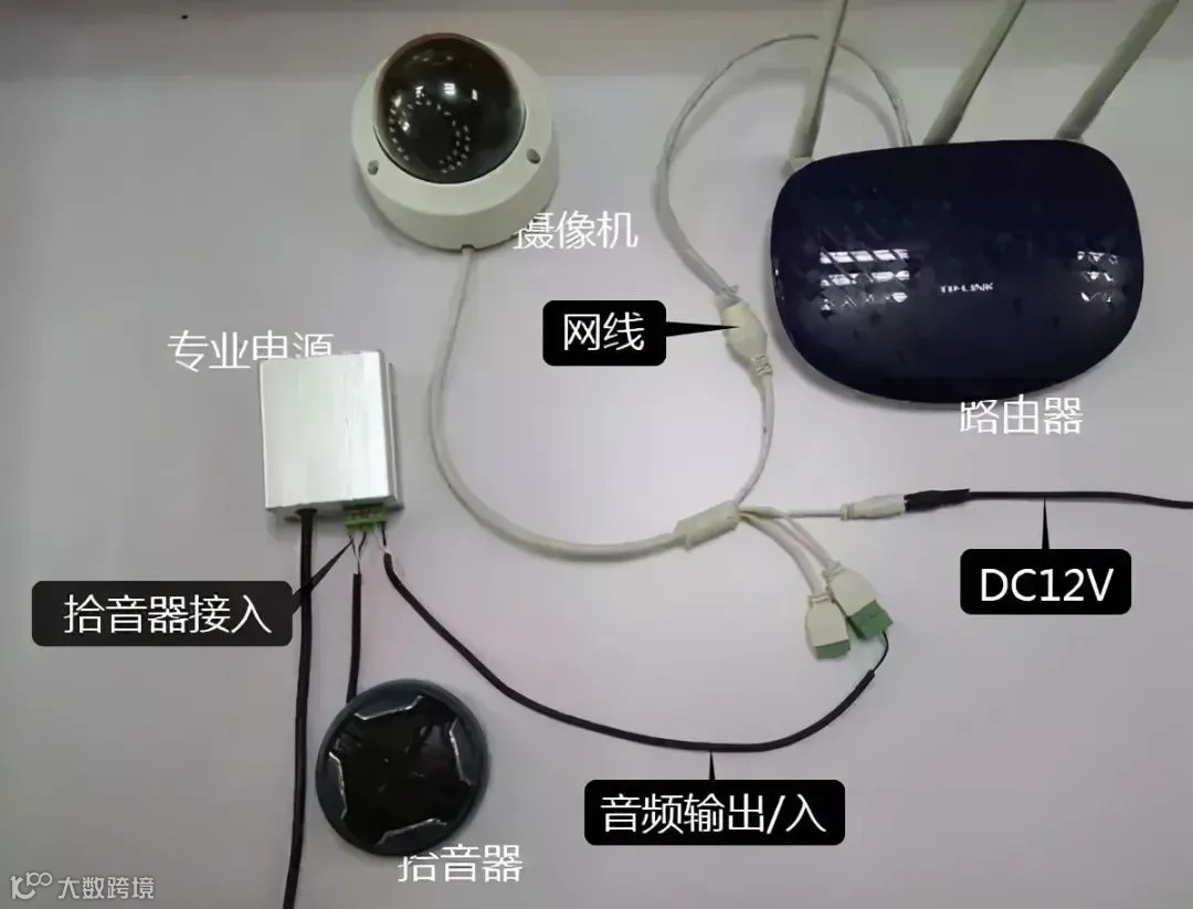 将拾音器对应接至配件上,然后分别给拾音器供上电,将电源接到配件的DC公头,将音频接到摄像机上的音频输入端口(莲花插口)再给摄像机供上电,借由网线连接至路由器(交换机)。后端(NVR或者PC主机)通过路由器访问前端,即可进行音视频同步监控。