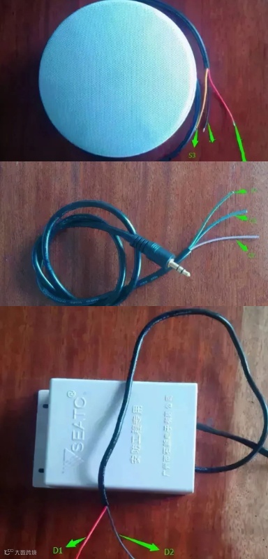 此类接线比较简单,普通的拾音器一般有三根线,一般是信号线、电源正极,电源负极。