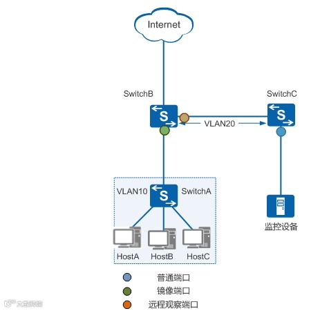 观察端口:是指连接监控设备的端口,用于将镜像端口复制过来的报文发送给监控设备。