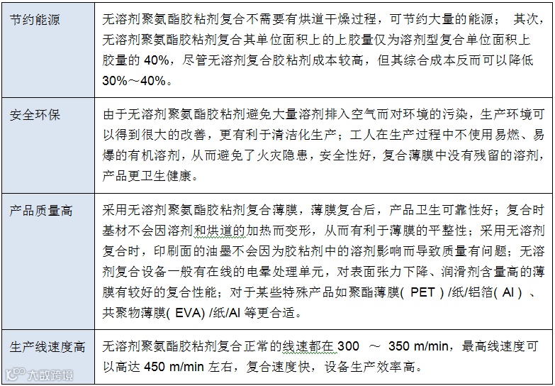 在复合软包装领域,无溶剂聚氨酯胶粘剂不仅在环境保护、安全生产、产品质量的提高、生产高效等表现出明显的优势,而且在降低生产成本、提高经济效益方面效果十分显著。