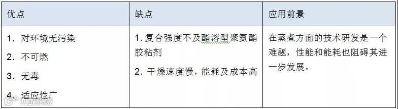水性聚氨酯复膜胶是以水代替了醋酸乙酯或乙醇作为介质,优点在于:由于是乳液体系,其粘度不随聚合物分子量改变而有明显差异,可以使聚合物高分子量化、高固含量化以提高其内聚强度,不易燃,环保且易于清理。但水性聚氨酯复膜胶中添加了添加了封端剂、乳化剂、稳定剂、PH调节剂和抗寒防冻剂等,这些助剂也会带来弊端,因此也不能说其是完全环保的。同时,水性胶粘剂存在一些不足,如水的挥发较慢,烘干需要提高烘道温度,加长烘道,耗能较大;初粘性较差;价格相对较高;对塑料薄膜的润湿性查;长期接触水蒸气会使铁制设备部件锈蚀。