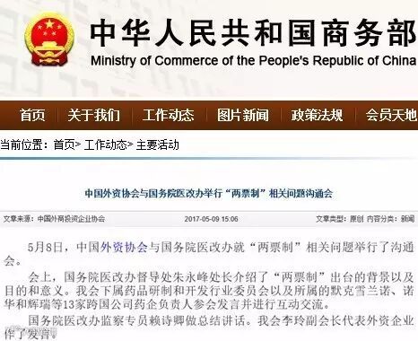 来自商务部的消息,5月8日,中国外资协会与国务院医改办就“两票制”相关问题举行了沟通会。