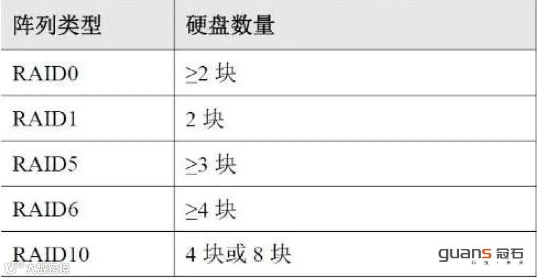 这里面列出了常用阵列类型至少所需硬盘的数量: