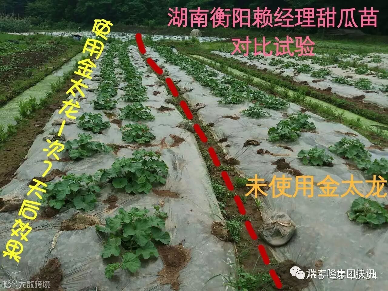 瑞丰隆集团快讯 金太龙在湖南一个月来,取得了突飞猛进的效果和销量。尤其在湖南衡阳市场,赖经理亲自做的甜瓜苗对比田,使用金太龙1次,喷施7天后效果显著,对比明显。其中左边两行是喷过金太龙的,右边是没喷的,左边的瓜苗明显比右边的大,叶片绿,厚实!