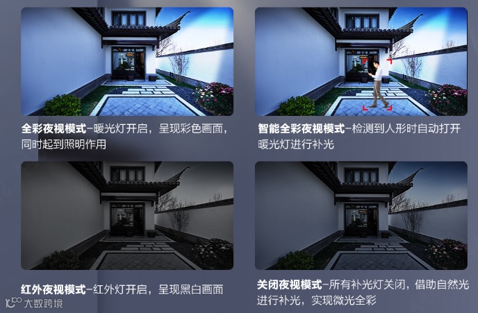 👉 若是安装在庭院,夜间经常有人或者车子等物体经过,建议开启智能全彩夜视模式,能够在有物在画面中时看到画面中的物,无物时摄像头自动切换成红外夜视模式;