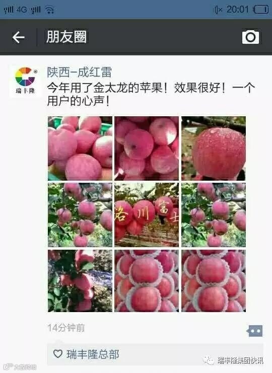 瑞丰隆集团快讯接下来看到的图片都是喷施金太龙超浓缩液体肥料后结果的洛川苹果,也是金太龙陕西洛川用户的真实照片。苹果个大均匀,果面洁净,色泽艳丽,果形更是没得说的漂亮!陕西市场推广金太龙主要是在苹果种植区,这次金太龙进入洛川全国知名的苹果产区,并取得这么好的效果也是意料之中!用过金太龙的客户都说:有效果自然有市场!就像我们洛川的富士一样,金太龙不愁销量!