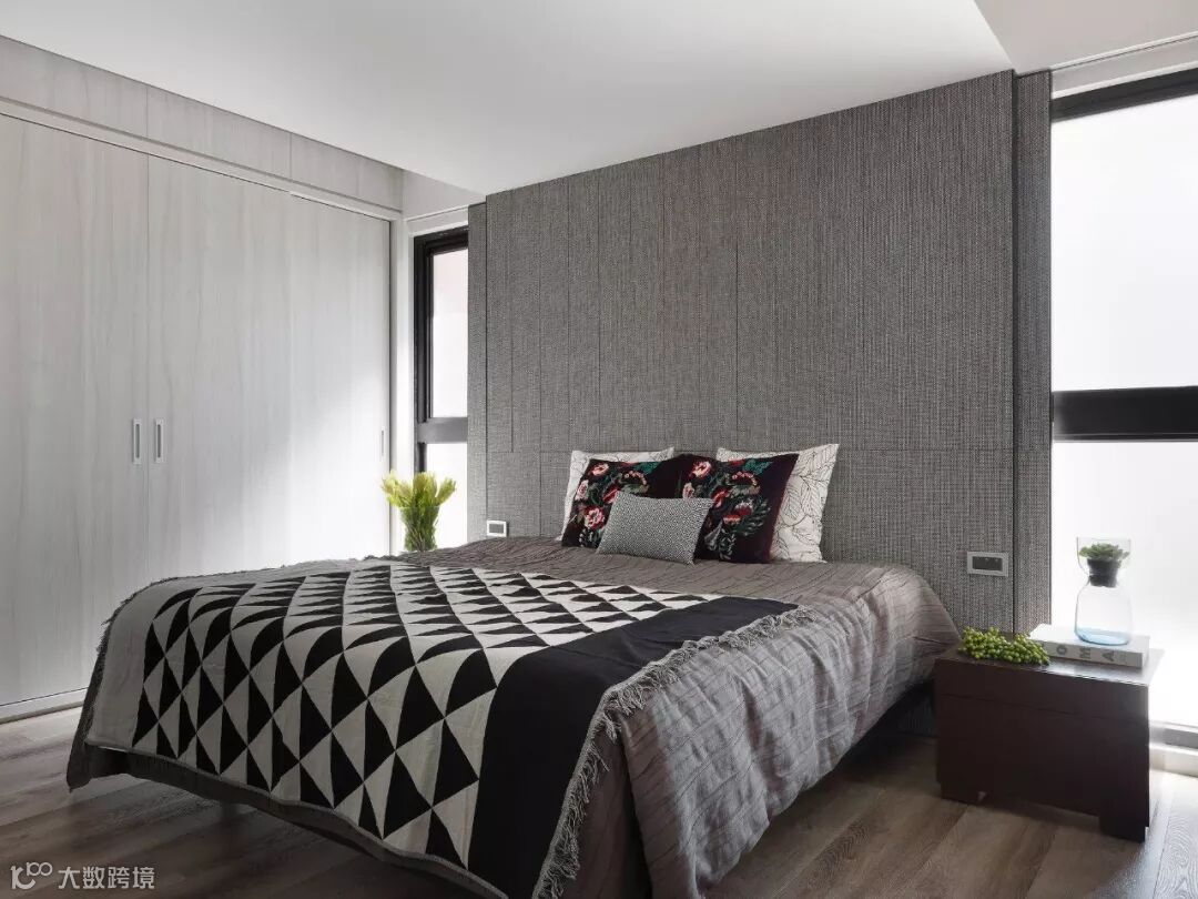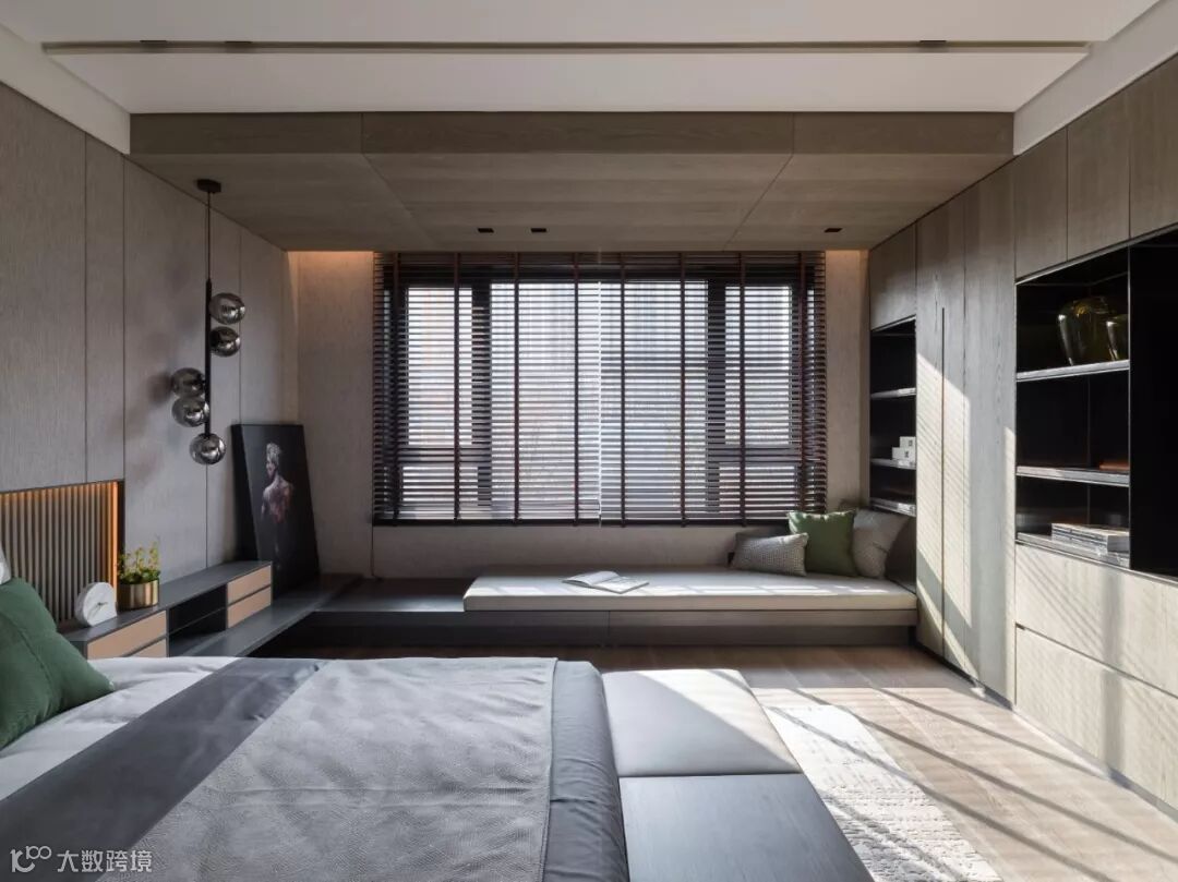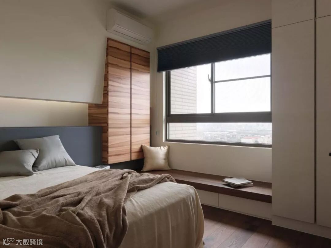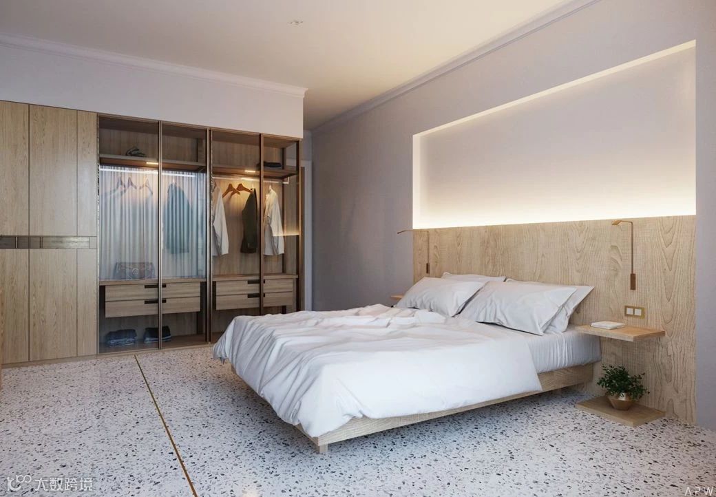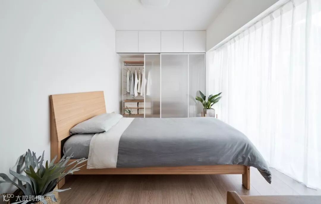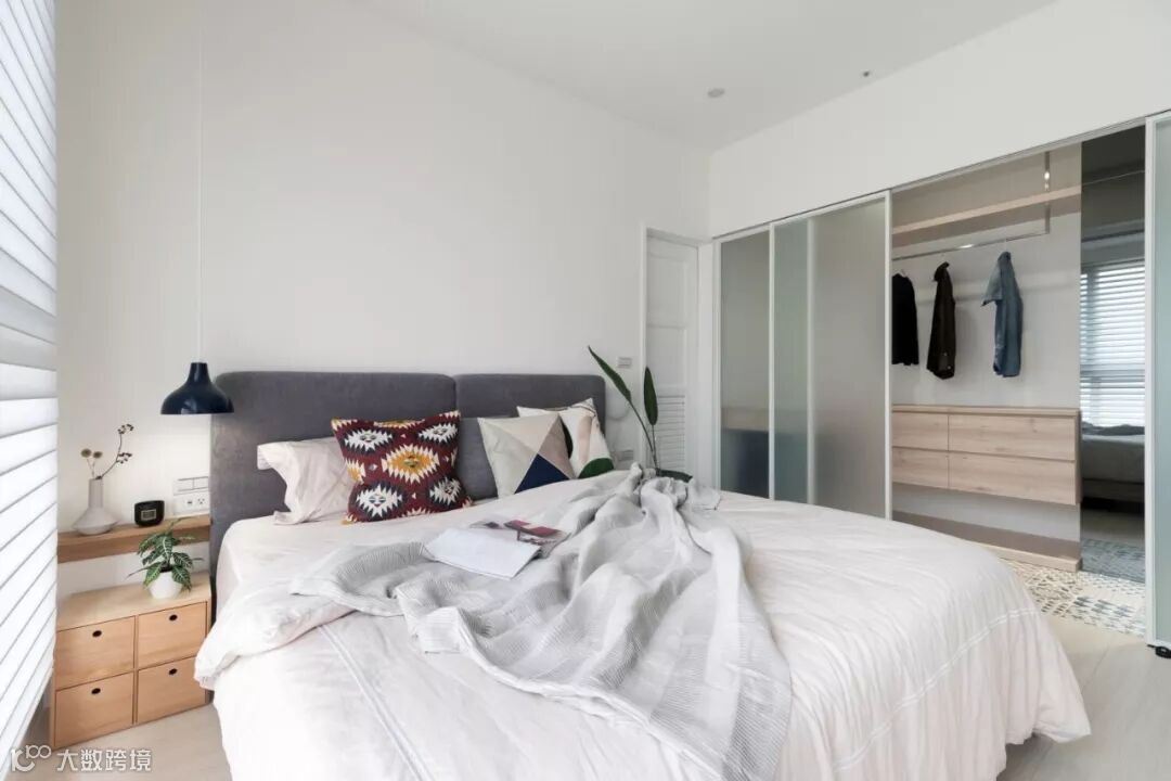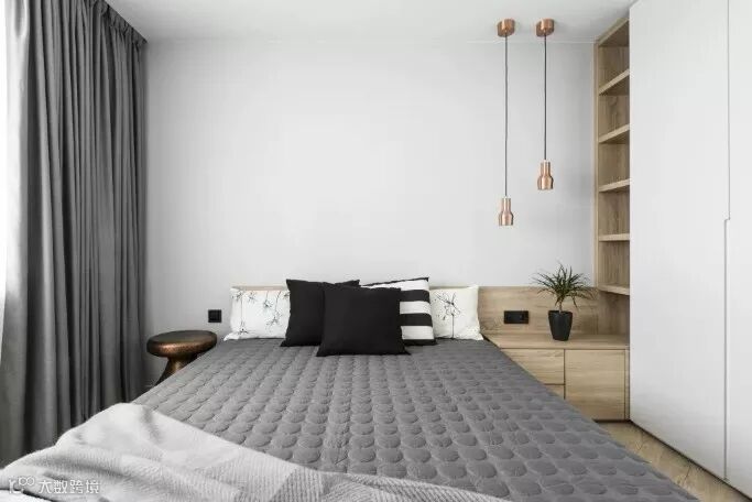 若在卧室不太大时,即使放上床头柜,其与衣柜之间的空间利用率也不大。既然如此,不如将床头柜与衣柜组合,做一排隔板做装饰用,还可以增加床头柜的利用面积。