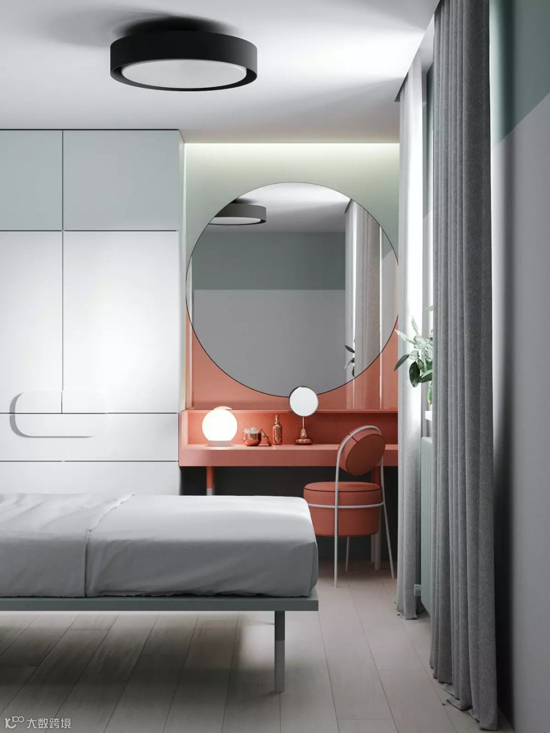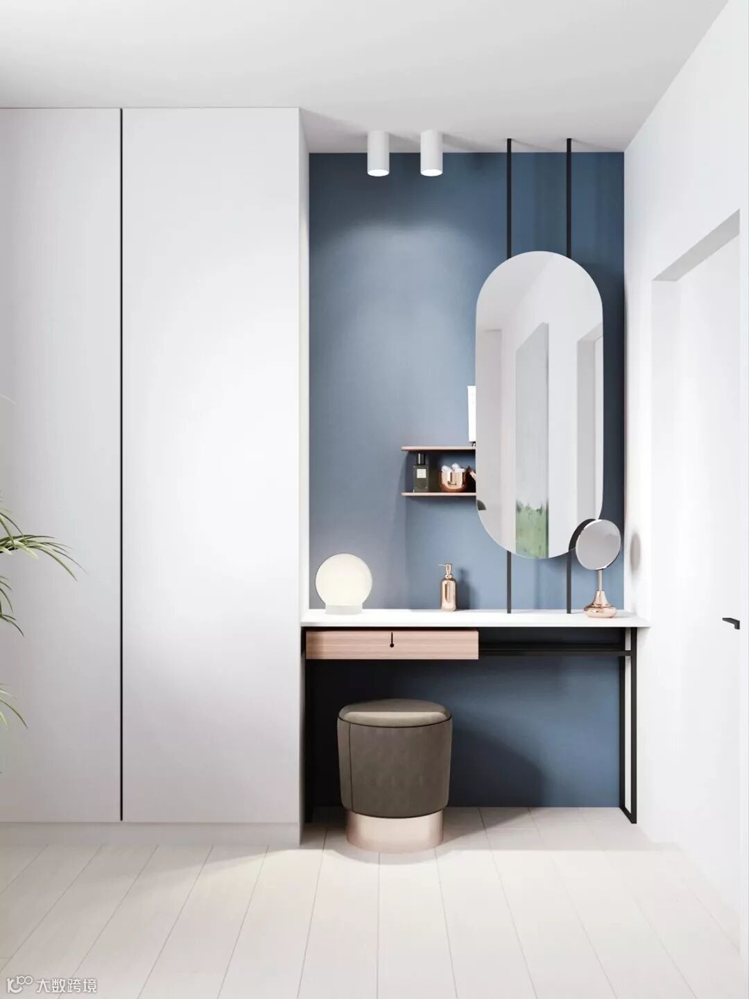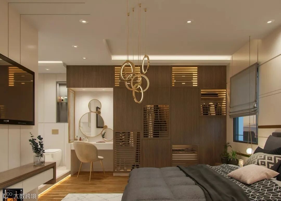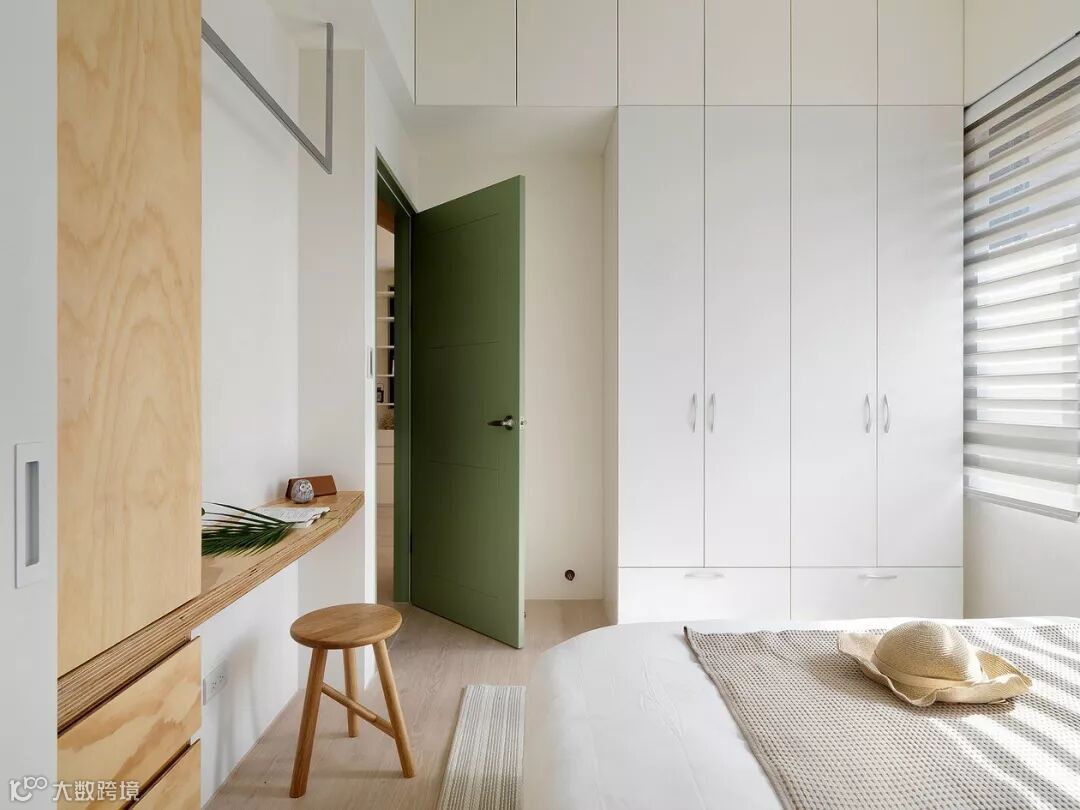 整体延伸出来的梳妆台也很不错,可以摆放更多的生活起居物品。